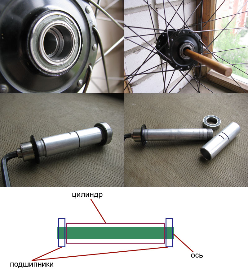 если вытащить ось то цилиндр, который остается внутри между подшипниками - двигается его можно сместить и тогда подшипник можно подцепить, вообще-то подшипник можно просто выдавить.