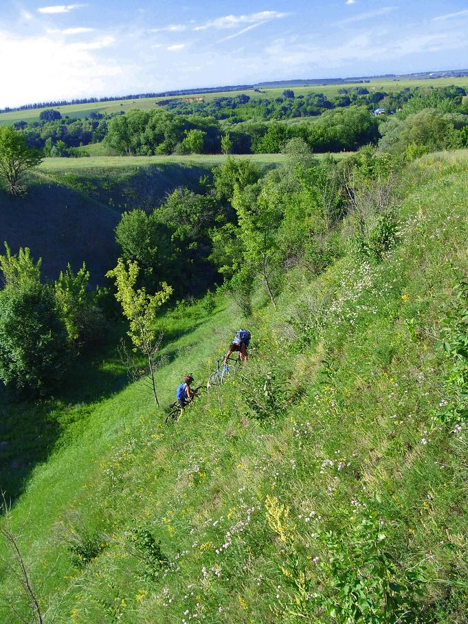 Мы же почти все время ехали по грунту. Нас преследовали воспоминания о зимних покатухах, остро не хватало Рождественской пурги и январского мороза в -25. И снега по колено не хватало, поэтому мы часто ехали по целине, в траве по пояс, продирались через трехметровых тростник, штурмовали овраги с уклоном 50%. Зимой нет дорог, есть только направления.