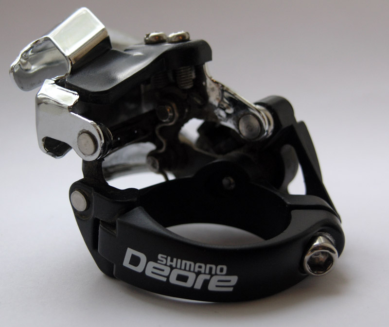 1. Можно сказать, новый передний переключатель Shimano Deore с верхней тягой. Диаметр на толстую подседельную трубу. 450р
