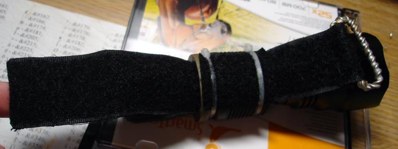 Дальше – само крепление на фонарик. На одном из форумов вычитал, что неплохо подходят для этого старые грипсы с руля. Чтож, почему бы и не попробовать, тем более, что мои старые грипсы идеально подходили к диаметру фонаря – достаточно легко на него налазили, но в то же время сидели плотно. Лента же, с помощью которой фонарь должен крепиться к рулю, была сшита из различных по типу липучек (с крючочками и ворсинками). Кольцо, через которое прокидывается лента, было спаяно из 3-х скрученных вместе медных жил электрического кабеля. Готовая лента пропущена между грипсой и фонарем, а потом закреплена с помощью двух пластиковых хомутов. Итого, на изготовление креплений ушло под 3 часа. Думается, совсем немного, т.к. это был первый опыт изготовления подобных креплений.