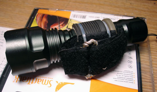 Дальше – само крепление на фонарик. На одном из форумов вычитал, что неплохо подходят для этого старые грипсы с руля. Чтож, почему бы и не попробовать, тем более, что мои старые грипсы идеально подходили к диаметру фонаря – достаточно легко на него налазили, но в то же время сидели плотно. Лента же, с помощью которой фонарь должен крепиться к рулю, была сшита из различных по типу липучек (с крючочками и ворсинками). Кольцо, через которое прокидывается лента, было спаяно из 3-х скрученных вместе медных жил электрического кабеля. Готовая лента пропущена между грипсой и фонарем, а потом закреплена с помощью двух пластиковых хомутов. Итого, на изготовление креплений ушло под 3 часа. Думается, совсем немного, т.к. это был первый опыт изготовления подобных креплений.