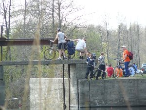 Я все никак не настрою новый вел. Сегодняшняя сотня с лишним из - за этого прошла для меня тяжеловато. Ноги разболелись, на полную мощность крутить не удавалось. А было где. Песочек попадался на всем протяжении маршрута. Да и длинные асфальтовые куски вроде М.Приваловка - Орлово не радовали туловище. Массовость в очередной раз была достигнута. По - моему нас было больше, чем байдарочников на слете. Ivana благословил мероприятие, по своему обыкновению искупавшись в костюме Адама под пристальными взглядами с противоположного берега. Наверно, дальше стало еще интереснее, но наша группа побыла на мостах всего около часа и двинулась обратно. Вояжируя через наши пригородные поселки который раз спрашиваю себя: отчего жители гадюшников вроде Тресвятской не какают себе в постель? Это так же удобно как и вываливать весь мусор за околицей, что они уже с успехом проделывают. Впрочем я несправедлив к тресвятчанам. Кучи не меньшие красуются и в Отрожке. Зато обычно в таких местах лучше всего знают что России - русский порядок, о чем и пишут неподалеку от упомянутых кучь.