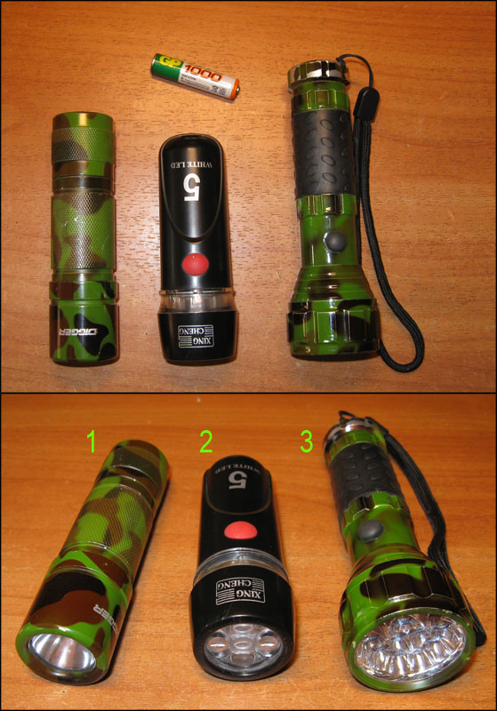 3. фонарик, 14 светодиодов, питание 3*ААА, 2 режима (сильный/слабый), 150 ру.