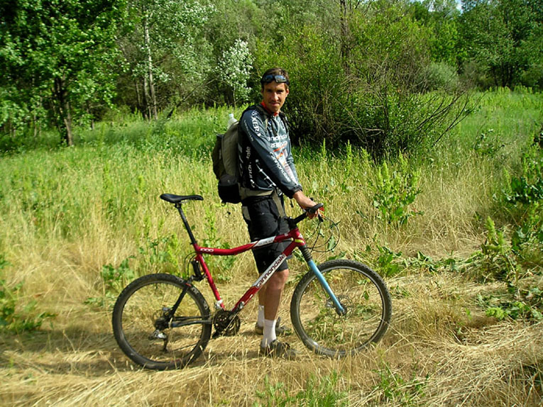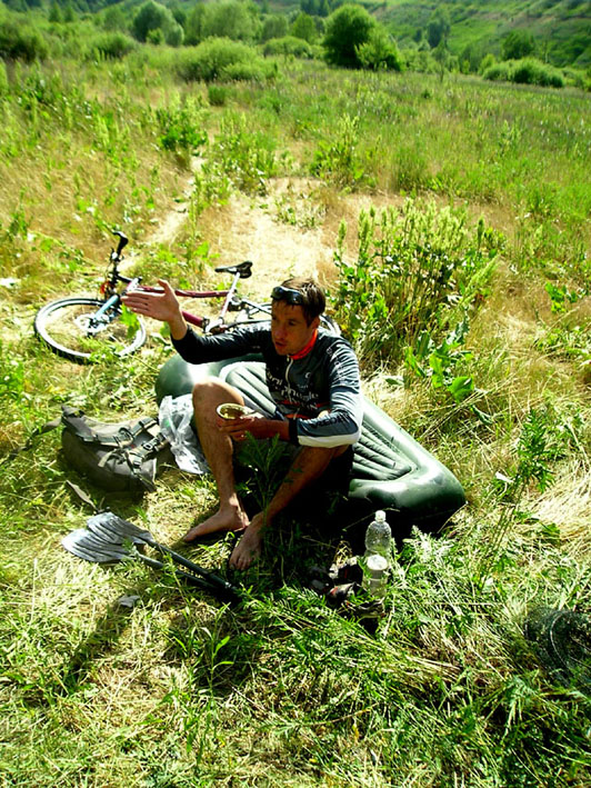 Ну что же, с небольшими изменениями программу выполнил. Стартовал поздно, в 11 часов от танка. В это время в сторону Сенного уже двигался тяжело груженый Жени с Тигрой. Из Липецка на машине двигался Еретик. При правильном раскладе все должны были встретиться на реке Воронеж выше Сенного напротив Излегощенского пляжа с тарзанкой. Про призовой мордодуй рассказали уже в других ветках. У второго поста ГАИ я свернул с М4 вправо. чтобы через дачи и лес вылезти в СтароЖивоТинное и Айдарово. От Института Сахарной Свеклы под Рамонью решил срезать и поехал полями. Срезать удалось несильно. Оказался у ступинского поворота и поехал привычными аствальдами Ивницы-Борки-Лопатки-Карачун-Глушицы-Сенное. По моим расчетам мои друзья должны были быть на месте. Хотел укоротить маршрут и ехать на место встречи, ниже синдякинского острова, но не нашел нужную дорогу и очутился в Синдякино в километре выше начала острова. Наступал волнующий момент спуска на воду плавсредства. Надул его как мог и начал размешать на нем вел, привязав его на всякий случай штатным концом. (конец - это веревка). Вел привязал на нос, не снимая колес. Сам попытался сесть на корму. Корма изогнулась и судно приняло на борт воду. Пришлось садиться на нос, на вел и рюкзак. Ударил веслами по воде и завертелся на месте. Лодка оказалась очень верткой. В воду с одного борта свисало переднее колесо и создавало сопротивление. Лодка охотно крутилась вокруг этого колеса. вместо того, чтобы плыть вперед. Причалил к берегу. Переднее колесо снял и привязал штатным концом к заднему. Стартовал наконец. Сидеть на раме было неудобно. Всякие попытки изменить положение тела грозили водозабором. Но теперь ветер был попутный и вместе с течением они несли судно в правильном направлении. От прохладной воды лодка подсдулась. У начала синдякинского острова причалил к берегу и надул ее посильнее. На остров высаживаться не стал. Пошел правой, широкой протокой, где течение побыстрее. Прошел остров. навстречу двигалась плоскодонка с мотором. Приготовился бороться с волной. Надо сказать, что несмотря на ветер, на реке волн не было. Покачался на волнах от моторки, а тут и поворот реки за которым должно было быть место встречи. На мои крики сбежались друзья, накормили консервой, напоили чаем, высушили лодку и подмоченные документы (результат первого фальстарта). Упаковал лодку. сел на вел, поехал. При ветре в спину доехал до города как на форсаже. На этот раз удалось срезать полями и выехать к Институту Сах. Св. Теперь знаю как не заезжать в Ивницы-Борки-Лопатки по дороге в Сенное.