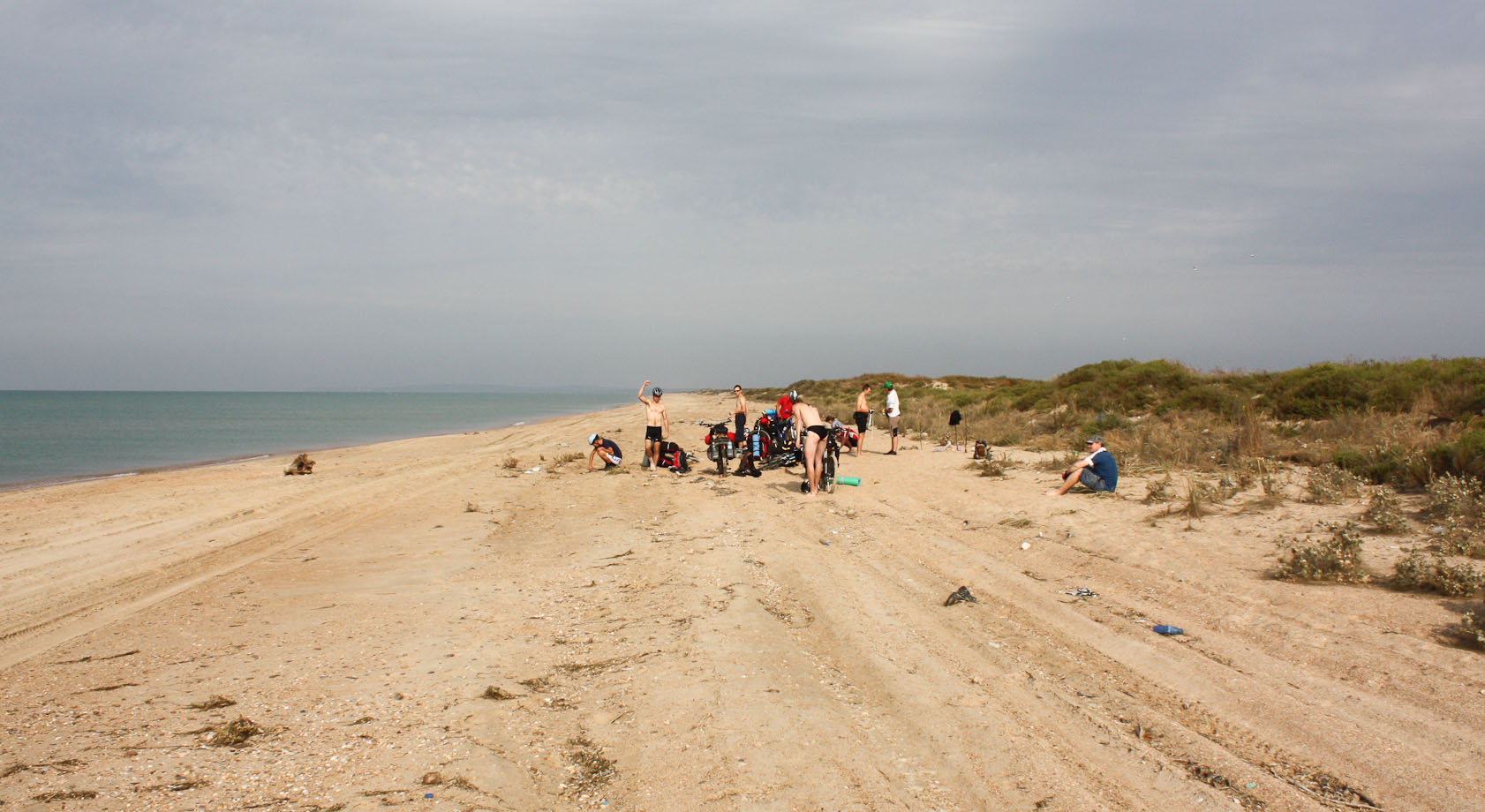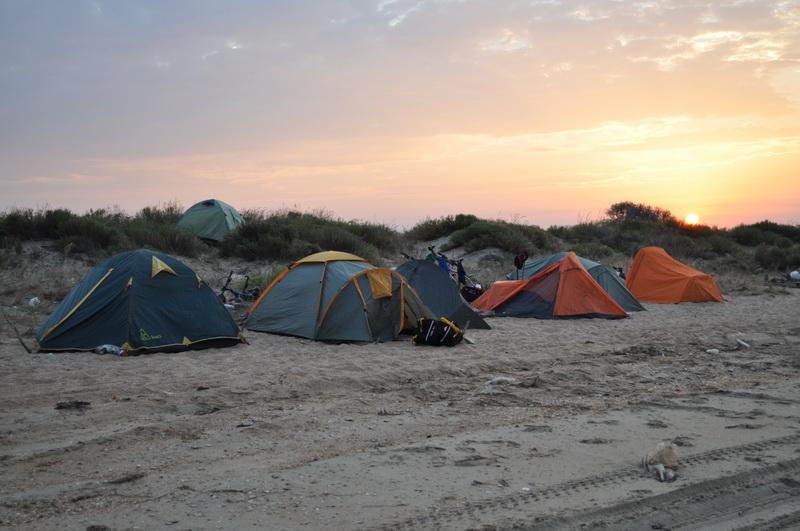 Впервые попробовали море на вкус, пляж радовал мягким песком и обилием красивых ракушек, далее по маршруту таких ракушек мы не встречали. Прокатились по косе около 4 км, разместили лагерь, наша первая ночевка, разместились прямо на песочном берегу, по которому лихо гоняли на квадроциклах соседи серферы. Времени много не потребовалось, оперативно поставили пататки, приступили к приготовлению ужина.