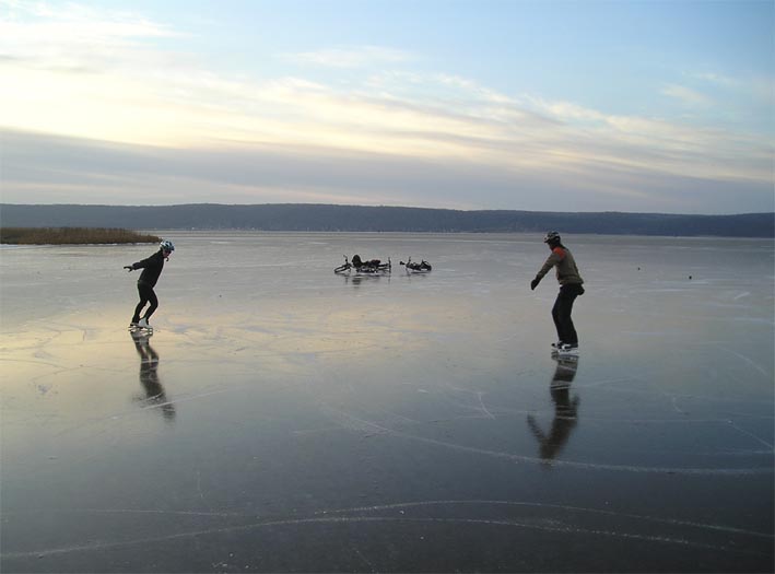 Предлогаю в воскр в 11:00 слева от Чернавского моста собраться и покататься. Желающие есть?Сейчас ездил по льду водохранилища. Скользко, несмотря на покрышки Лёд гладкий, не трещит. На коньках лучше будет.