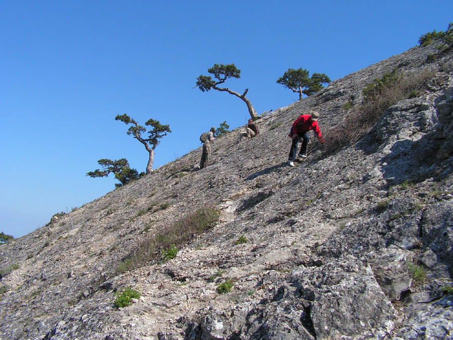 Участники разбиты группами, что то возбужденно обсуждают и понемного направляются вверх по тропинке обозначенной полосатой лентой.