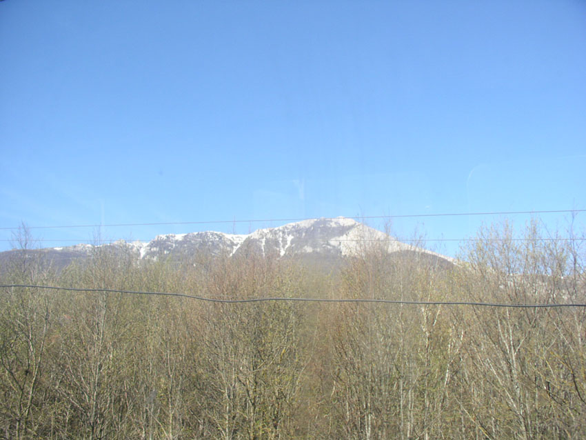 А да, велы мы не взяли ввиду большого количества переездов-пересадок и на самом деле они только бы помешали нам посмотреть соревнования. Едем на тролейбусе, он проезжает по достаточно высокогорной части Крыма -- на вершинах гор все еще лежит снег (честно говоря было неожиданностью):