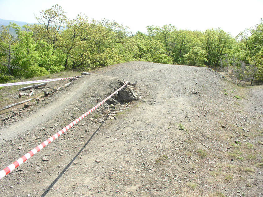 Алушта. Вылазием из троллейбуса озабоченные вопросом, легко ли будет найти на г. Ай-Йори место проведения соревнований, т.к. сами понимаете гора она большая и вся покрыта лесом. Никаких плакатов или опозновательных знаков, но на нашу удачу недалеко от остановки сразу видим райдера в полной downhill амуниции. Обращаемся, райдер снимает шлем и о как! оказывается женщиной лет 35 (ну мне так показалось) и как то немного будто из другого мира, медленно, о чем то другом паралельно думая пытается сформулировать дорогу. Ну что то (немного) понятно, можно купить еды на день и идти искать. Вернувшись из магазина райдершу уже не застаем на месте и начинаем идти по городу в указанном направлении. Мне приходит мысль что дети лет 10-15 наверняка должны знать про такое мероприятие и вообщем то да, пара пацанов подтверждает что мы идем правильно и даёт дальнейшие уточнения маршрута. Выходим к окраине города, сзади нас один за другим догоняют участники и мы понимаем что вообщем то вот что мы ищем -- надпись означает Finish / Alushta Cup!