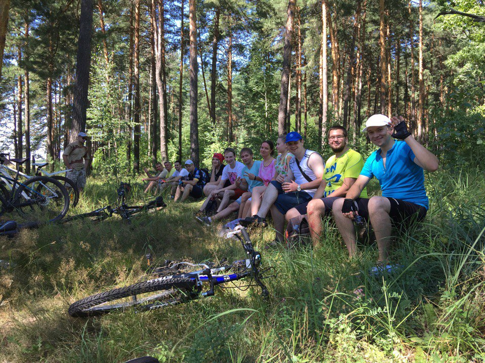 Стартовали вшестером, но на первой же развилке около минуты ждали мужчину, представившегося на старте Виталием. Его велосипед явно не подходил для мягких и иногда песчаных лесных дорожек. Получив от него заверение, что отстав, он продолжит путь один, мы покатили дальше в том же темпе. На следующей развилке мы его уже не дождались - видимо, вернулся на асфальт. Отпишитесь, как продолжили путь, пожалуйста