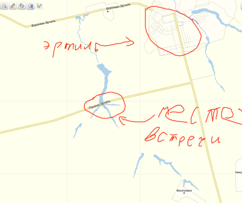 Телефон мой в профиле, встречусь я с вами на мосту через Красноармейский пруд. Это последний мост через водоём перед приездом в Эртиль, на картинке нарисовал и отметил!