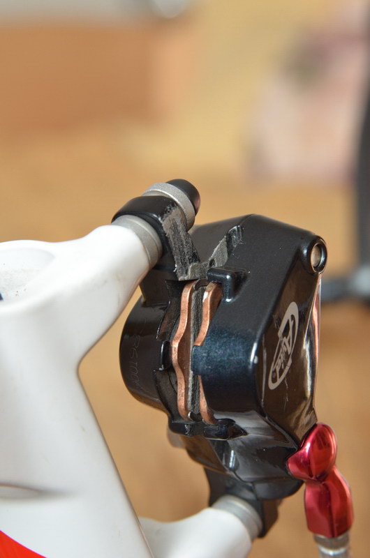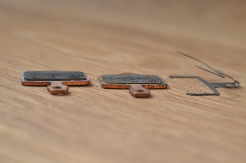 На переднем калиппере, у меня Avid Elixir, сильно стерлись колодки, особенно одна, даже появились потертости, при том, что пробег не большой около 2000 км, а может и меньше.