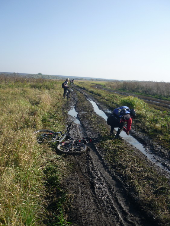 Спасибо всем за компанию и поздравляю приобщившихся впервые к этому маршруту. Нельзя сказать, что он такой уж выдающийся. Скорее традиционный из серии Must Taste. Обычно он проходит при пониженном сцеплении с грунтом и ярко выраженной какообразности последнего. Так уж повелось. Сегодня природу пытались обмануть. Намолили по Гисметео солнечную погоду и ввосьмером двинули от цирка. Недж как и обещал приехал на шоссере. Он ведь человек слова. Все шло нормально до венгерско-фашистского кладбища на горе после Гремячьего. Потом аствальдт кончился и Недж почуствовал, что данное слово трудновато удержать в руках из за козней грунтового покрытия. Но все равно почти все Костенки он проехал вместе с остальными. А потом мне сделалось видение, что непременно надо свернуть в улицу, в которую вроде бы раньше и не сворачивали. Тут же мы оказались в пойме Дона и именно в этом месте дорога приобрела классическое, упомянутое выше какообразное состояние. Начались заносы и падения, повернуть назад означало слишком быстро признать свою ошибку. А дорога куда то вела по пойме. Куда именно - выяснилось через три километра. Дорога уперлась в берег Дона, густо покрытым колючими зелеными тестикулами. За ручейком начиналось болото, и попасть к видневшимся неподалеку на высоком берегу домам не представлялось возможным. Развернули оглобли и выехали по своим следам в Костенки. Недж решил, что накатался, и уехал аствальдтом, а мы продолжили движение на Борщево, куда после штурма подъема, а затем спуска по лесу и прибыли. Дальше знакомая дорога по пойме к мосту, украшенная дертами. Очевидно местные любители экстрима постарались. Дерты были совсем некатанные. Галя их обновила. После моста и короткого привала, при попутном ветре двинули придонскими лугами обратно. Сначала дорога была идеальной, а потом испортилась, разбитая коровьими копытами. Ехали и думали: хорошо, что Недж не поехал сюда на шоссере. Потом - горелая турбаза ГОО, погоновские луга, дорога вдоль газопровода, дачи на Воронеже. После дач, на подъезде к плотине встретили монстра велотуризма Александра. Он как специально нас поджидал. Через плотину вернулись на родину. Мамонтиада зачтена. Не всех знаю по никам. Кто был ,напишите.