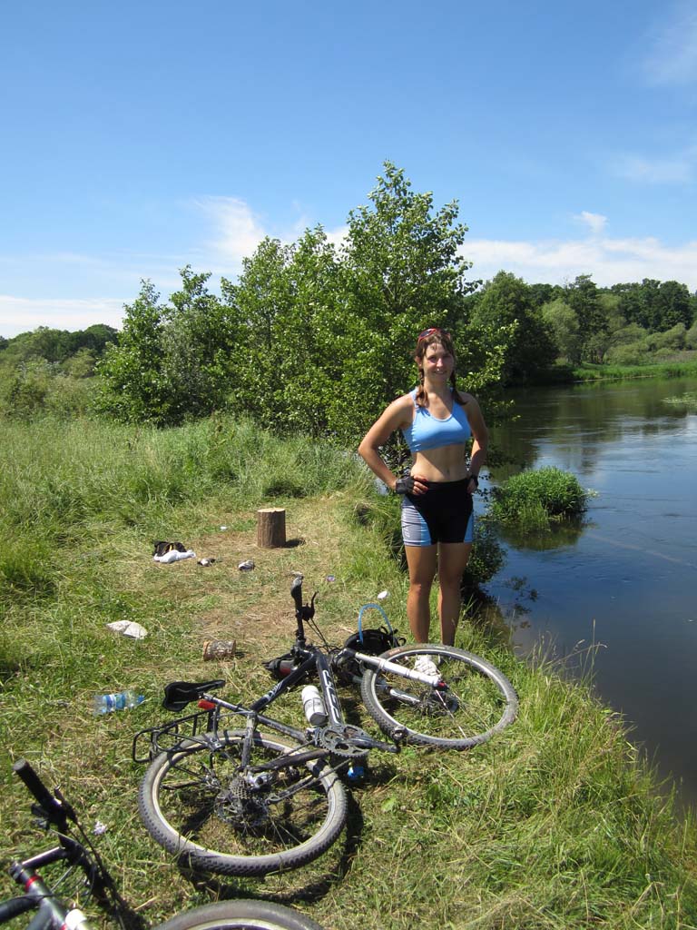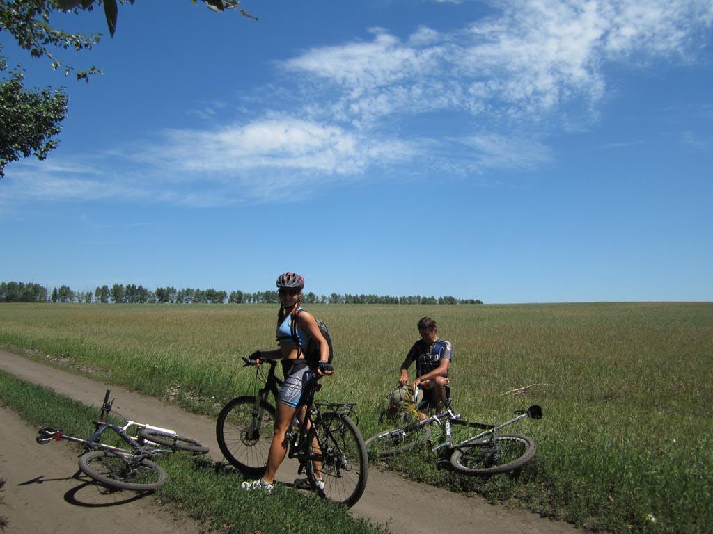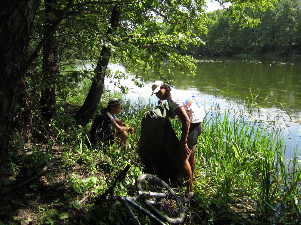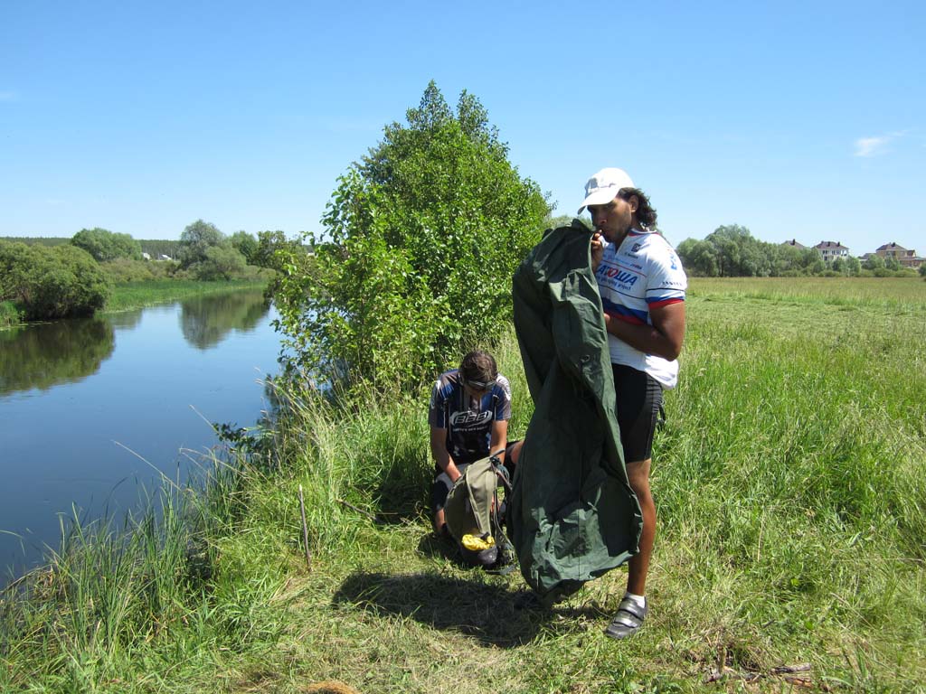 Все человечество слезло с пальмы. Об этом неоднократно подчеркивал еще Чарли Дарвин. Именно глубинной тоской по пальме, как по своей прародине, объясняется стремление человечества посидеть на травке вдали от угара столицы черноземья. Галя, Недж и я искали пальмы в северном направлении от Воронежа, на берегах одноименной реки, где прохладные струи чуть раздаются, образуя остров. С высоты правого берега подле села Глушицы, куда мы добрались через Ст.Ж.Тинное и Айдарово, миновав Рамонь по красивой грунтовке в полях, острова не было видно. Он скрывался за пойменной дубравой. Перед дубравой вовсю шла заготовка болотных трав на корм сельским зверушкам. Колея, петляя по покосу, нагло заныривала в грязь и очумело прыгала в дубраву. За дубравой обнаружился еще один покос и недалекая Нелжа на противоположном берегу Воронежа. Остров тоже обнаружился. Мы выехали к его южной оконечности, где два рукава Воронежа встречаются. Осмотр острова с противоположного берега протоки не выявил наличия на нем пальм, а выявил отсутствие места для причаливания.Поэтому решили проплыть вдоль острова по протоке и переправиться к Нелже. Чтобы спуститься на воду пришлось попринимать нелепые позы и поиздавать надсадные звуки. Берег был высотой метра три и к воде вели вырубленные в грунте ступеньки. Надутая лодка с тремя привязанными велами плохо вписывалась в профиль. Из воды на нас с интересом поглядывали рыбы, довольно крупные. У берега было сразу глубоко. Кроме велосипедов в лодку усадили меня. Галя и Недж, для такого случая поскидавший с себя все исподнее, залезли в воду и баржа двинулась вниз по течению на удивление катерам и гидроциклам, которые добрались и в эту глушь. Вскоре я сидел задницей в воде. Рюкзаки в кокпите тоже намокли. Все потому что закрепили велы не очень удачно, и лодка черпала воду бортом. Нелженский берег был, впрочем , недалеко и мы пристали к небольшому пляжу, где голый Недж пытался произвести фурор среди дам бальзаковского возраста. Сдули лодку и через Нелжу, знакомым зимним маршрутом отправились к Излегоще. В ее лугах поджидало два неприятных сюрприза. Во-первых, абсолютное отсутствие подходов к воде. Во – вторых, дикие тучи слепней и оводов. Решили двигаться к реке Воронеж по луговой болотине. Там где зимой месили сугробы. Колея периодически заныривала в грязь. У леса, знакомой дороги к могиле рыбака я не обнаружил, зато была дорога чуть южнее и тоже к реке. На левый берег Воронежа мы вылезли посередине, между Сенным и Дивноречьем. До Дивноречья было с километр вниз по течению. Надули лодку, навьючили на нее велы и теперь уже втроем поплыли рядом с ней вдоль по реке. Вода была теплая, течение быстрое. Подводная растительность нежно хватала за ноги, создавая полное ощущение, что сидишь на пальме. Со стороны наше плавсредство, должно быть, выглядело диковато. Очередной гидроциклист от удивления даже потерял шапку. Мы с Галей плыли впереди лодки, таща ее за собой. Неодетый Недж плыл у кормы. Так и проплыли этот километр, вызвав ажиотаж на Дивнореченском пляже. Уж не знаю чем. В Дивноречье сдулись, собрались, поднялись в гору и отправились в Воронеж, заехав по пути на мой заброшенный дачный участок. Там обнаружилась прорва малины, клубники и всякой вишни. Надо в середине недели вечером учинить туда шоссерную поездку. А то урожай пропадает. С Га