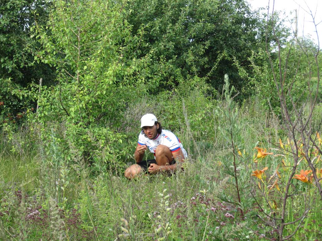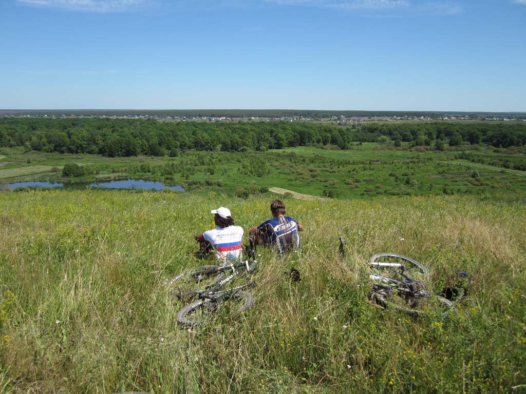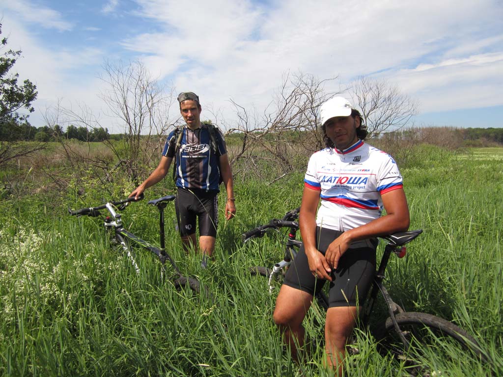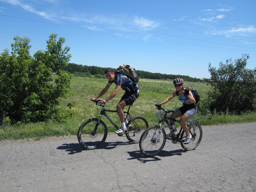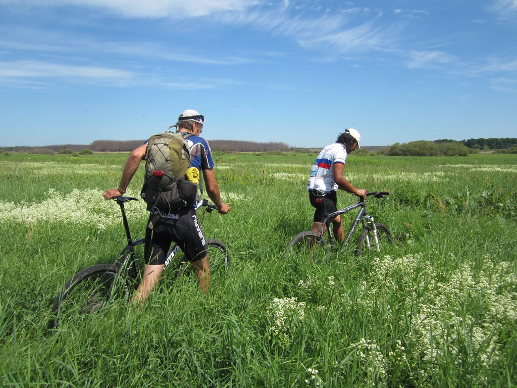 Все человечество слезло с пальмы. Об этом неоднократно подчеркивал еще Чарли Дарвин. Именно глубинной тоской по пальме, как по своей прародине, объясняется стремление человечества посидеть на травке вдали от угара столицы черноземья. Галя, Недж и я искали пальмы в северном направлении от Воронежа, на берегах одноименной реки, где прохладные струи чуть раздаются, образуя остров. С высоты правого берега подле села Глушицы, куда мы добрались через Ст.Ж.Тинное и Айдарово, миновав Рамонь по красивой грунтовке в полях, острова не было видно. Он скрывался за пойменной дубравой. Перед дубравой вовсю шла заготовка болотных трав на корм сельским зверушкам. Колея, петляя по покосу, нагло заныривала в грязь и очумело прыгала в дубраву. За дубравой обнаружился еще один покос и недалекая Нелжа на противоположном берегу Воронежа. Остров тоже обнаружился. Мы выехали к его южной оконечности, где два рукава Воронежа встречаются. Осмотр острова с противоположного берега протоки не выявил наличия на нем пальм, а выявил отсутствие места для причаливания.Поэтому решили проплыть вдоль острова по протоке и переправиться к Нелже. Чтобы спуститься на воду пришлось попринимать нелепые позы и поиздавать надсадные звуки. Берег был высотой метра три и к воде вели вырубленные в грунте ступеньки. Надутая лодка с тремя привязанными велами плохо вписывалась в профиль. Из воды на нас с интересом поглядывали рыбы, довольно крупные. У берега было сразу глубоко. Кроме велосипедов в лодку усадили меня. Галя и Недж, для такого случая поскидавший с себя все исподнее, залезли в воду и баржа двинулась вниз по течению на удивление катерам и гидроциклам, которые добрались и в эту глушь. Вскоре я сидел задницей в воде. Рюкзаки в кокпите тоже намокли. Все потому что закрепили велы не очень удачно, и лодка черпала воду бортом. Нелженский берег был, впрочем , недалеко и мы пристали к небольшому пляжу, где голый Недж пытался произвести фурор среди дам бальзаковского возраста. Сдули лодку и через Нелжу, знакомым зимним маршрутом отправились к Излегоще. В ее лугах поджидало два неприятных сюрприза. Во-первых, абсолютное отсутствие подходов к воде. Во – вторых, дикие тучи слепней и оводов. Решили двигаться к реке Воронеж по луговой болотине. Там где зимой месили сугробы. Колея периодически заныривала в грязь. У леса, знакомой дороги к могиле рыбака я не обнаружил, зато была дорога чуть южнее и тоже к реке. На левый берег Воронежа мы вылезли посередине, между Сенным и Дивноречьем. До Дивноречья было с километр вниз по течению. Надули лодку, навьючили на нее велы и теперь уже втроем поплыли рядом с ней вдоль по реке. Вода была теплая, течение быстрое. Подводная растительность нежно хватала за ноги, создавая полное ощущение, что сидишь на пальме. Со стороны наше плавсредство, должно быть, выглядело диковато. Очередной гидроциклист от удивления даже потерял шапку. Мы с Галей плыли впереди лодки, таща ее за собой. Неодетый Недж плыл у кормы. Так и проплыли этот километр, вызвав ажиотаж на Дивнореченском пляже. Уж не знаю чем. В Дивноречье сдулись, собрались, поднялись в гору и отправились в Воронеж, заехав по пути на мой заброшенный дачный участок. Там обнаружилась прорва малины, клубники и всякой вишни. Надо в середине недели вечером учинить туда шоссерную поездку. А то урожай пропадает. С Га