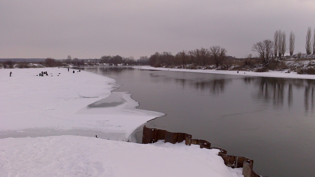 Мы не удивлены таким состоянием ледового покрова. Вонючка Голубой Дунай, впав в Дон, дает тепло половине области. Пойдем по понтону.
